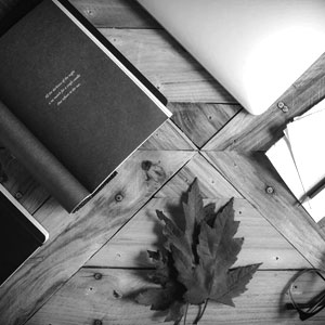 Young woman with glasses deeply focused on a laptop surrounded by art supplies in a home office.